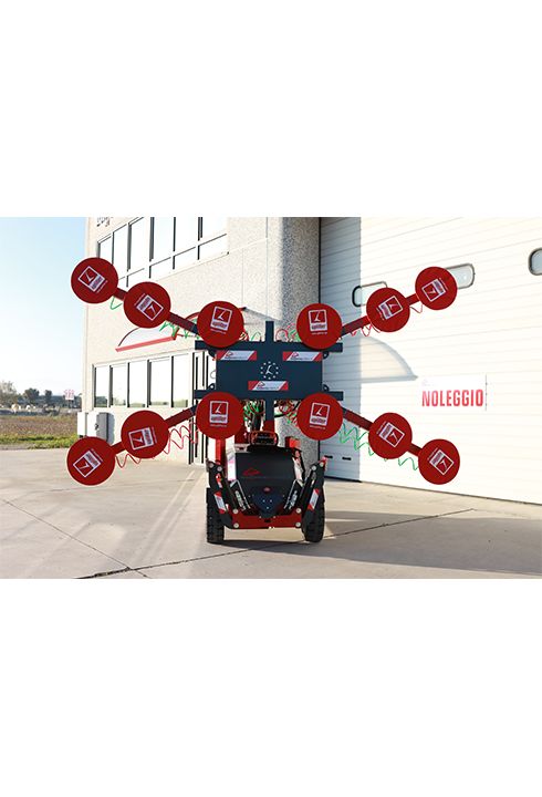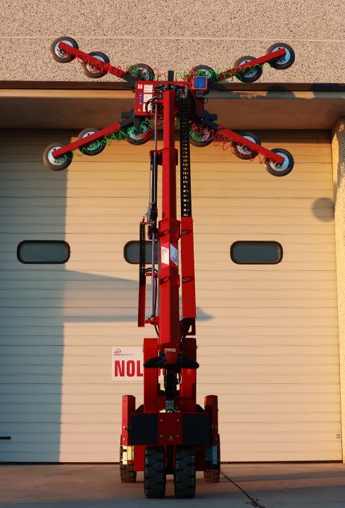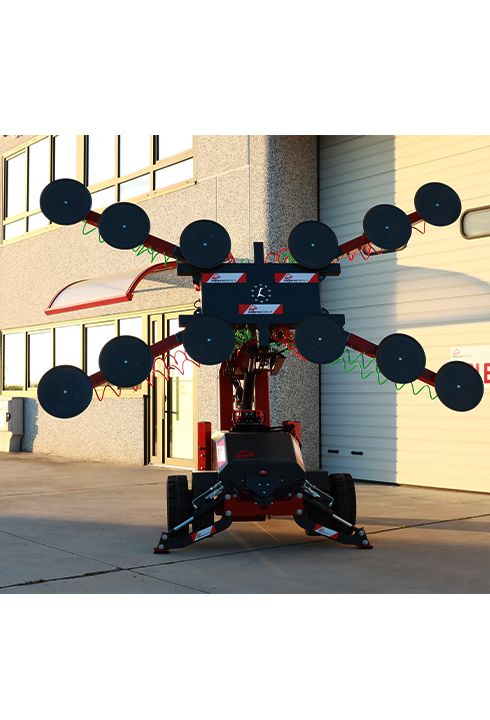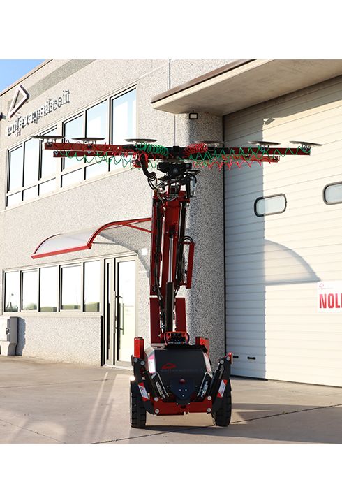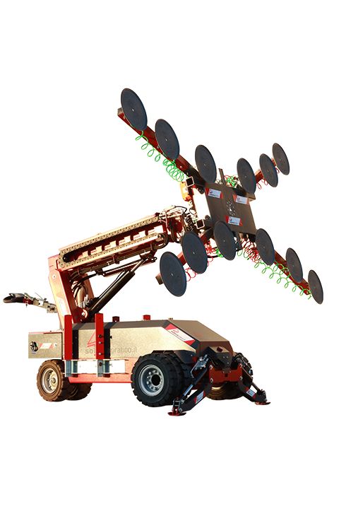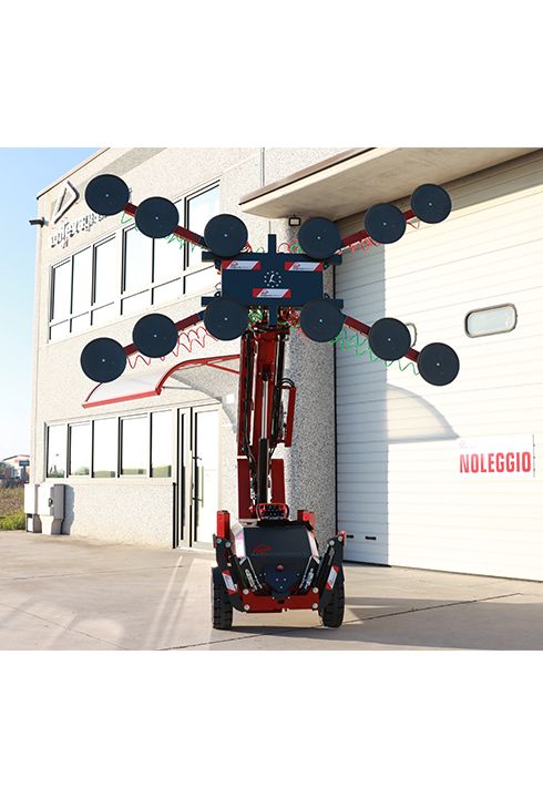Manipolatore per vetri ideale per la messa in opera di vetrate di grandi dimensioni e peso, fino a 1125 kg, finestre o portefinestre già vetrate e infissi in genere. Grazie alla movimentazione motorizzata lo si manovra anche in terreni accidentati con estrema semplicità, anche con un carico sulle ventose.