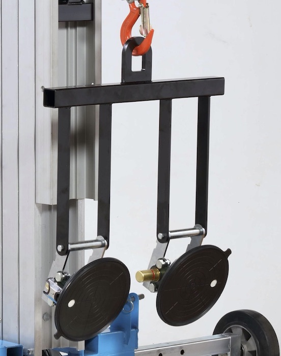 Steel support with four manual pump suction cups, for mounting glass on the roof, total maximum load 125 kg. Accessory suitable for vertical lifting with manual or electric lifters with hook attachment.