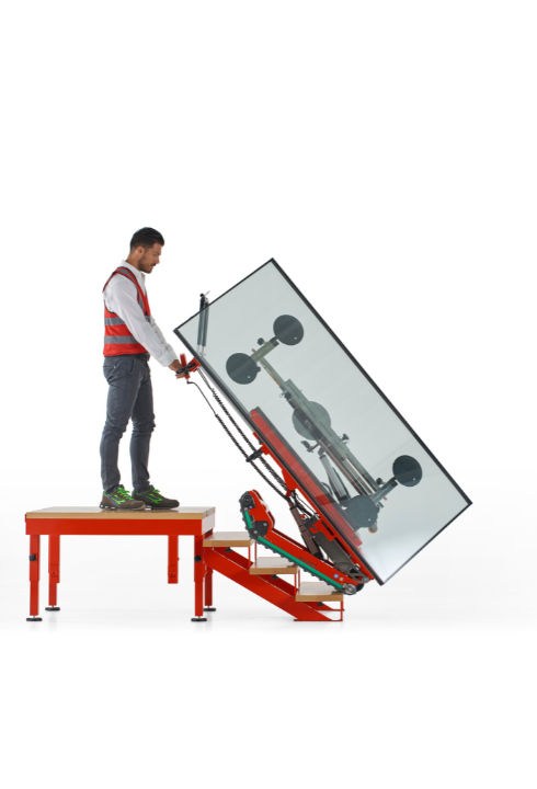 Oltre a questo è possibile caricare e scaricare il furgone e inoltre montare in cantiere il vetro all'interno dell'anta o telaio, avendo la possibilità di sollevare e inclinare elettricamente il vetro agganciato alle ventose.
