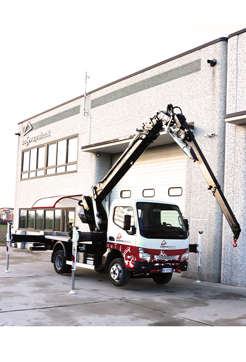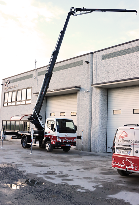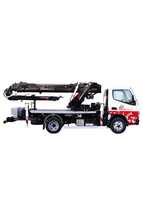 Autogru di dimensioni estremamente ridotte dotato di gru con portata massima 40 q.li, ideale per i sollevamenti o montaggi di vetro in spazi molto stretti.