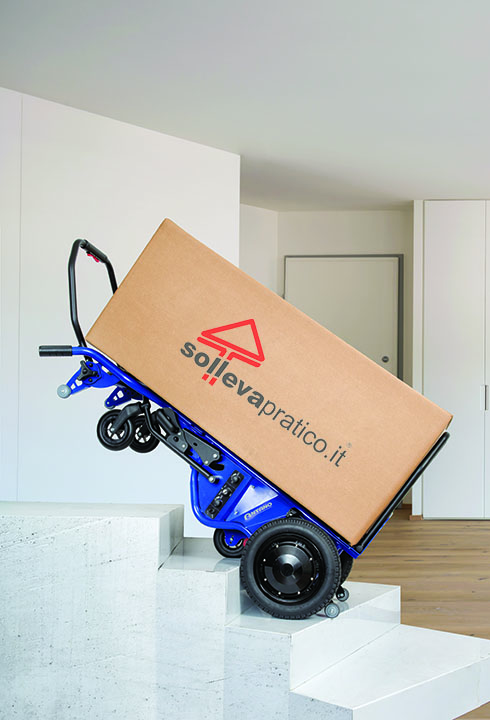 Il carrello elettrico saliscale dispone, inoltre, di sistemi di sicurezza efficienti e aggiornati: da un lato il blocco di regolazione dell’inclinazione del manubrio e, dall’altro, il sistema di riconoscimento del gradino per sospendere in automatico il movimento della ruota centrale del dispositivo.