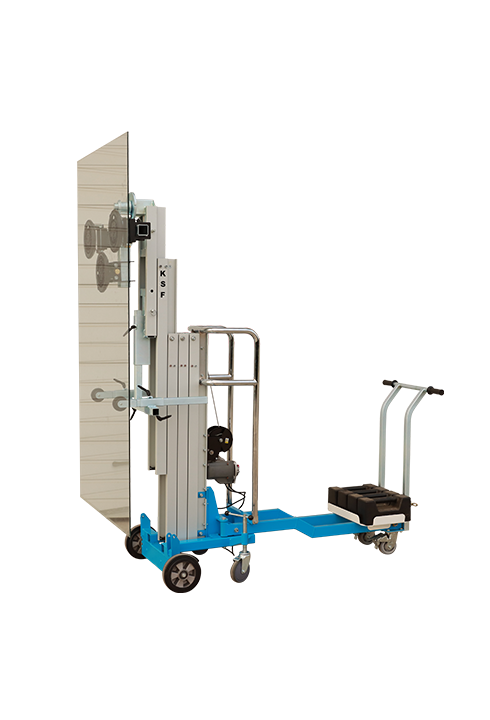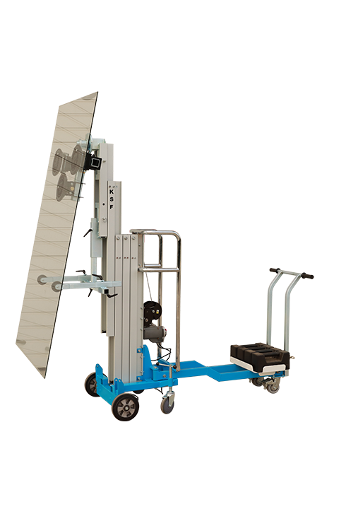 Ideale per montaggio e sostituzione parabrezza di autobus o camion grazie al sistema di regolazione inclinazione. Dotato di traslatore laterale che consente uno spostamento laterale del carico senza dover riposizionare il sollevatore.